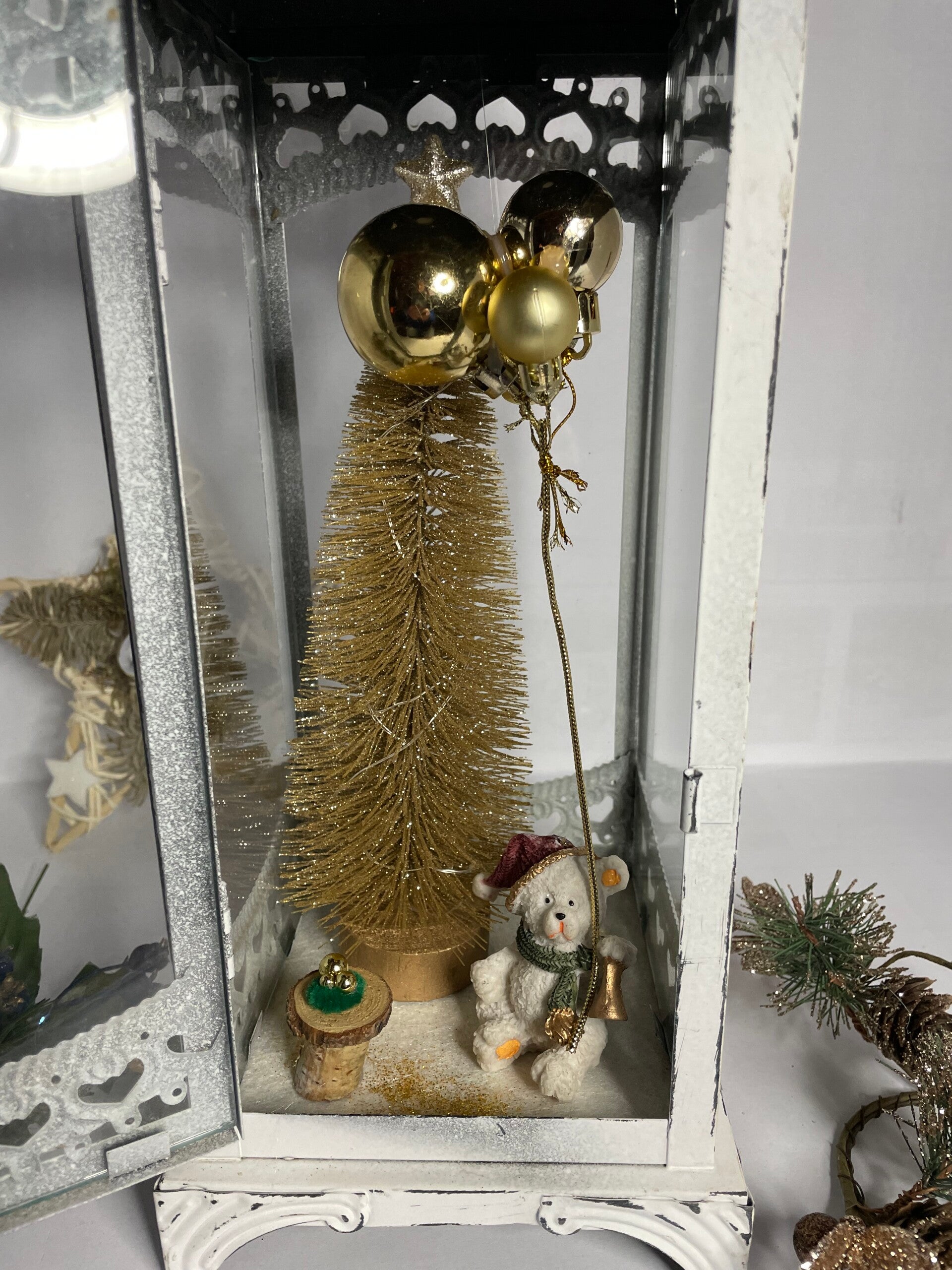 Die Laterne mit den Weihnachtsteddy ist aus Metall.